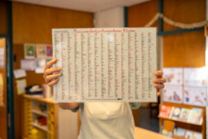 Aan het begin van de dag of voorafgaand aan bijvoorbeeld de geschiedenisles of het voorlezen van een prentenboek leg je dan het woord of de woorden uit, dit duurt maximaal 2 minuten. Ongeacht welke route je kiest, benadrukt Bas: “Eén keer horen is geen keer horen”. Het is cruciaal om de woorden consequent te herhalen, bijvoorbeeld in een spelvorm of in jouw eigen taalgebruik. En niet alleen dat ene woord of die twee woorden die je vandaag hebt uitgelegd, maar ook de woorden die je afgelopen tijd hebt uitgelegd. Deze woorden staan op een woordmuur die voor iedereen zichtbaar en leesbaar is. De woorden moeten immers continu terugkomen in je taalgebruik of consolideeractiviteiten. Als je merkt dat de woorden beklijven, gaan ze van de muur af en is er weer ruimte voor nieuwe woorden. In je dag zul je dus ruimte moeten maken om een aantal minuten jouw gekozen woordenschataanbod te consolideren. Dit hoeft niet veel tijd te kosten, maar vraagt wel om aandacht gedurende de hele lesdag.
